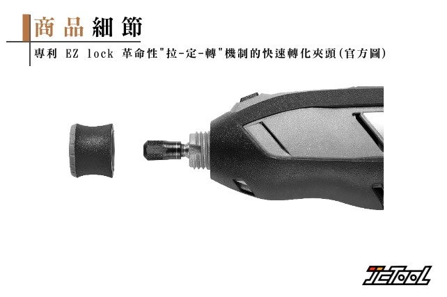 快速更換配件的專利 EZ lock 革命性"拉-定-轉"機制的快速轉化夾頭。