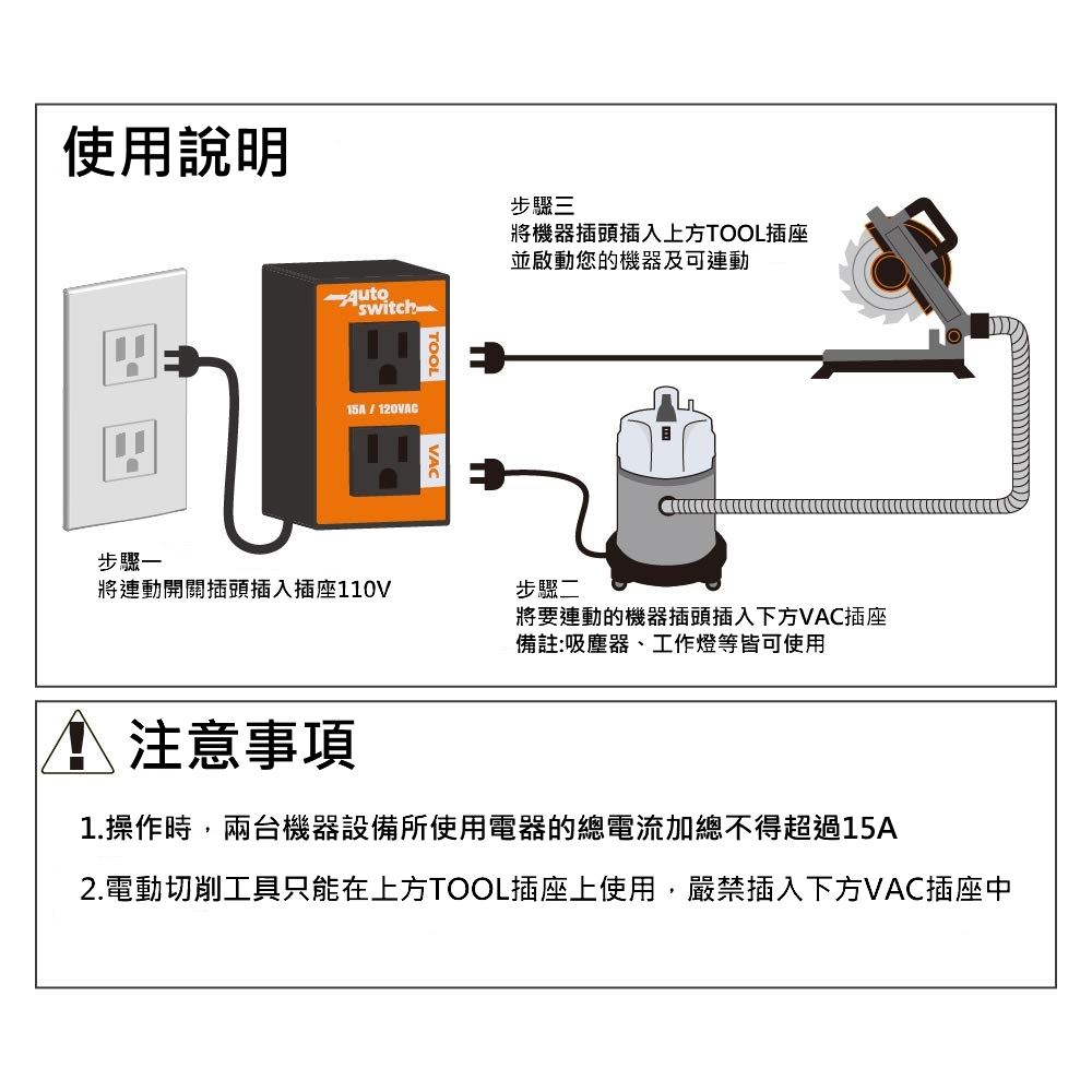 註:VAC插座的電器要維持ON的狀態,當電動工具啟動時連接VAC的吸塵或電器就會立刻啟動。