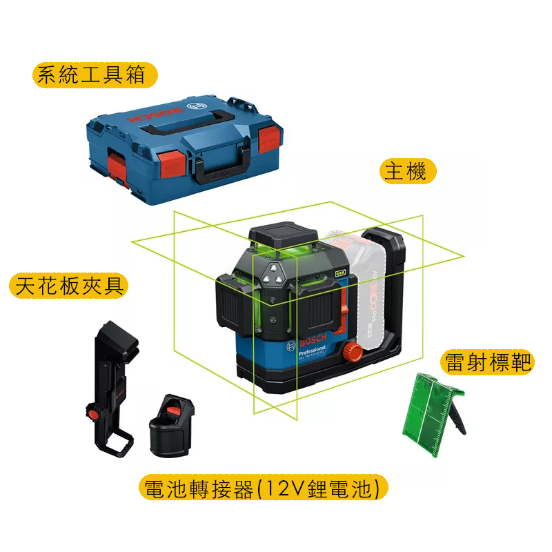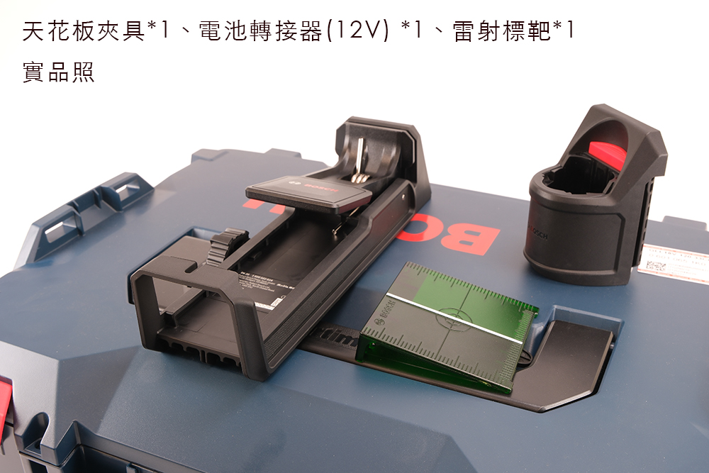 內容物:主機*1、天花板夾具*1、電池轉接器(12V) *1、雷射標靶*1、系統工具箱*1