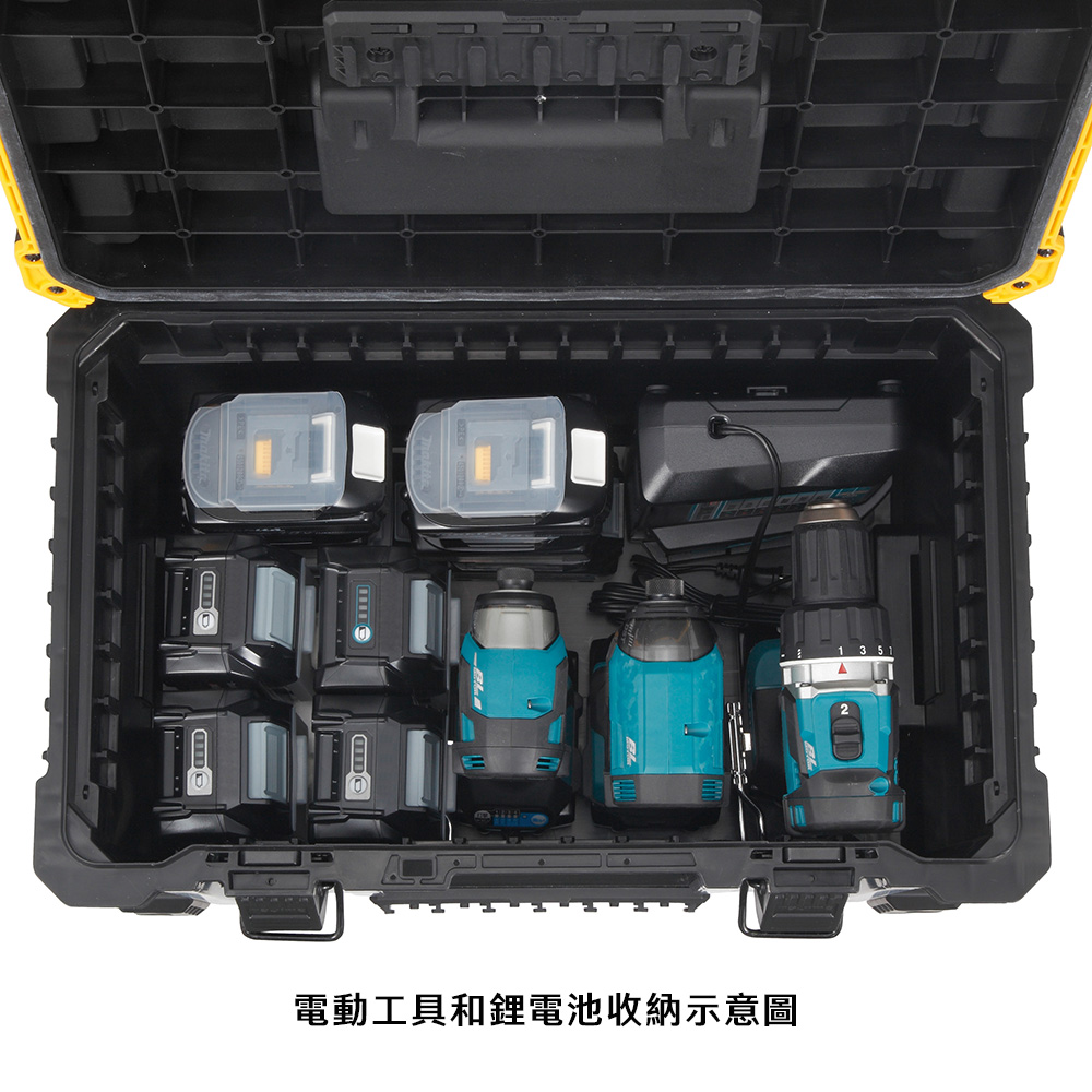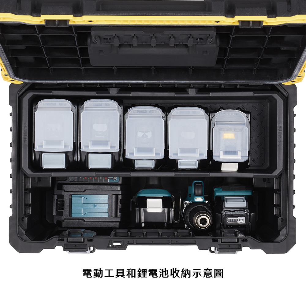 隨附可整齊排列收納電動工具電池的 L 型內部托盤