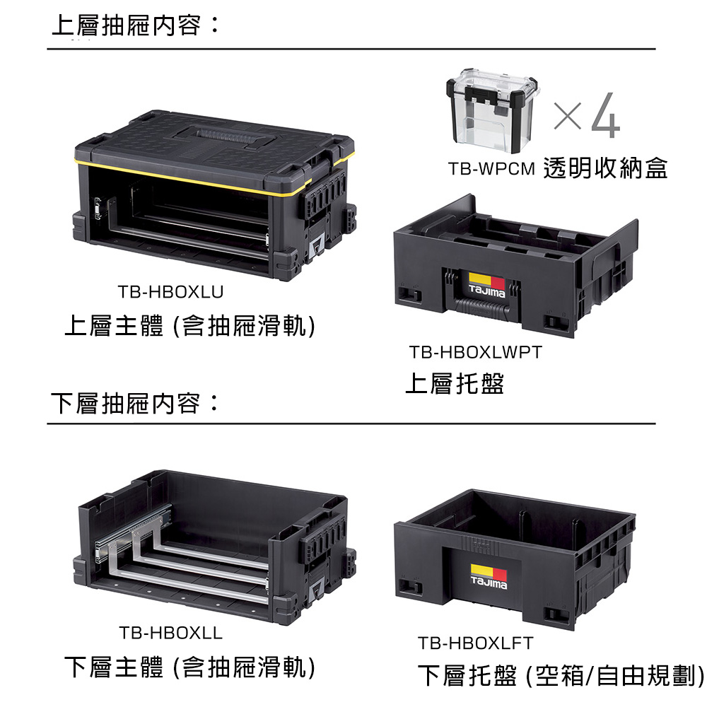 上層:零件盒托盤(TB-HBOXLWPT)、零件盒/M(TB-WPCM)×4個